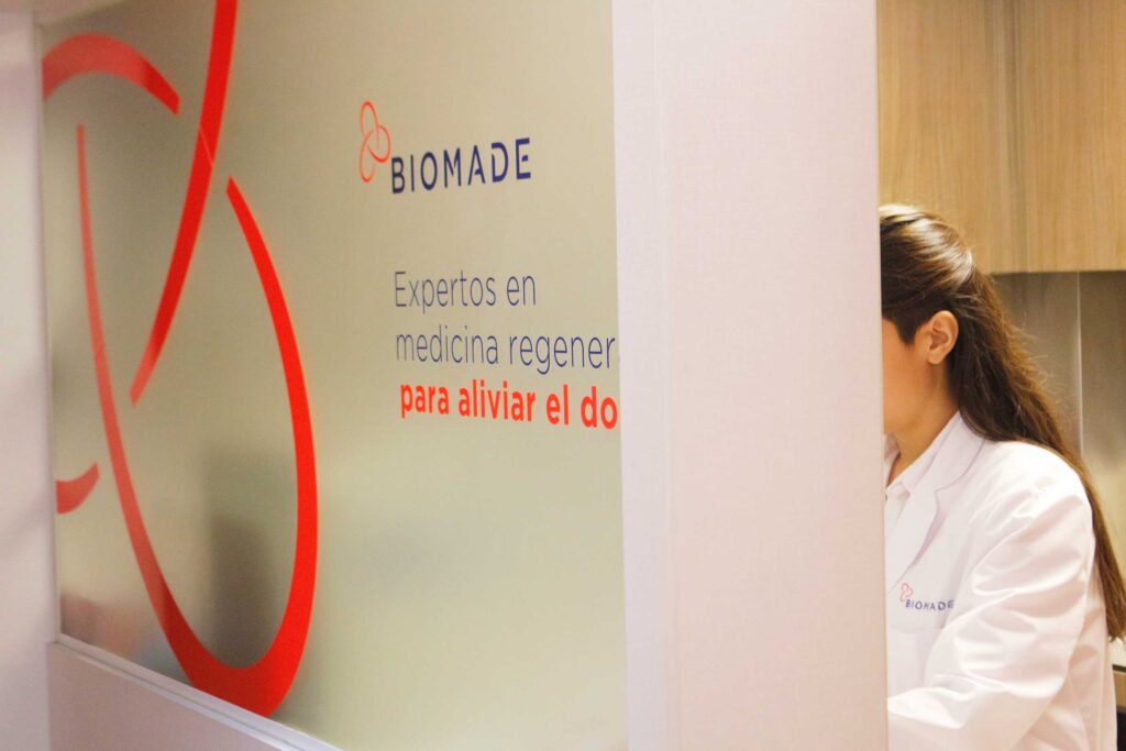 Al aplicar el protocolo de Biomade a la sangre extraída del propio paciente, se obtiene un concentrado de plaquetas (PRP) que, al ser inyectadas en la zona afectada, entran en contacto con los tejidos liberando una gran cantidad de factores de crecimiento.